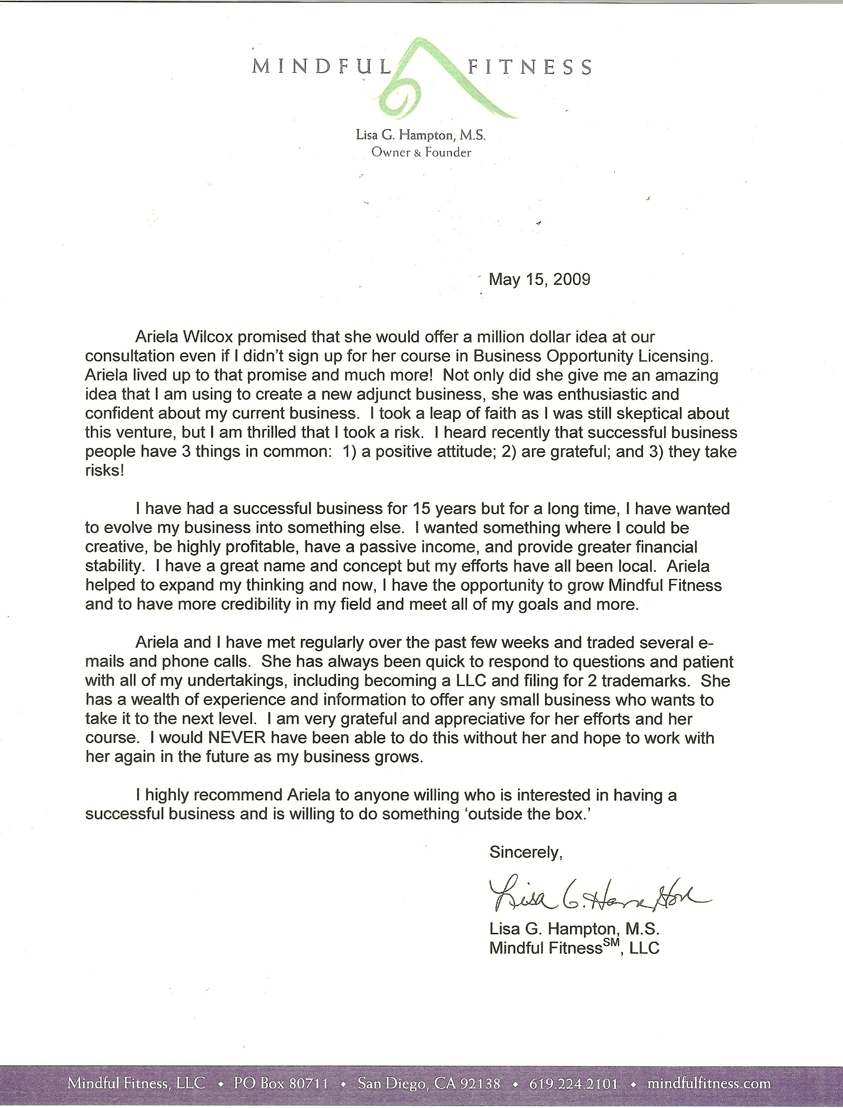 I highly recommend Ariela to anyone willing who is interested in having a successful business and is willing to do something ‘outside the box.’ ––Lisa G. Hampton, M.S.